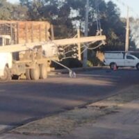 Colisão quebrou o poste, que ficou apoiado sobre o caminhão. Motorista não se feriu O…
