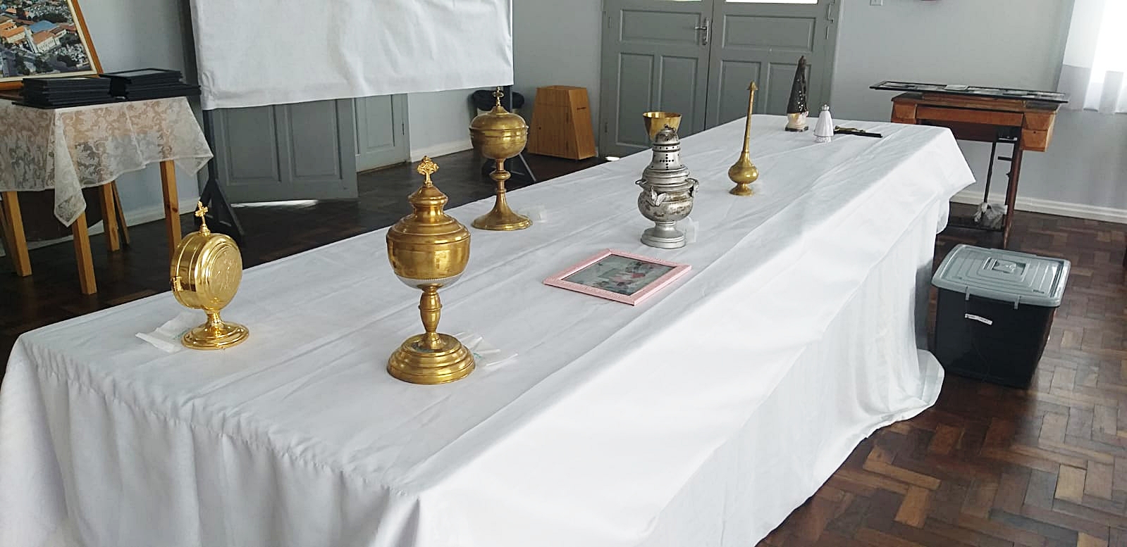 “Esses materiais são alguns que foram resgatados e estão sendo cuidados para serem expostos aqui e o pessoal ver como eram feitas as celebrações e as vestes dos sacerdotes, que eram muito diferentes das de hoje. Teremos também toda a história dos párocos, dos padres antigos que passaram. Então, você poderá lembrar do padre que te batizou aqui. Quem tiver uma idade de 60 ou 70 anos, poderá lembrar disso. Teremos também várias imagens de autores, artistas e pintores que estamos tentando resgatar”, comentou.