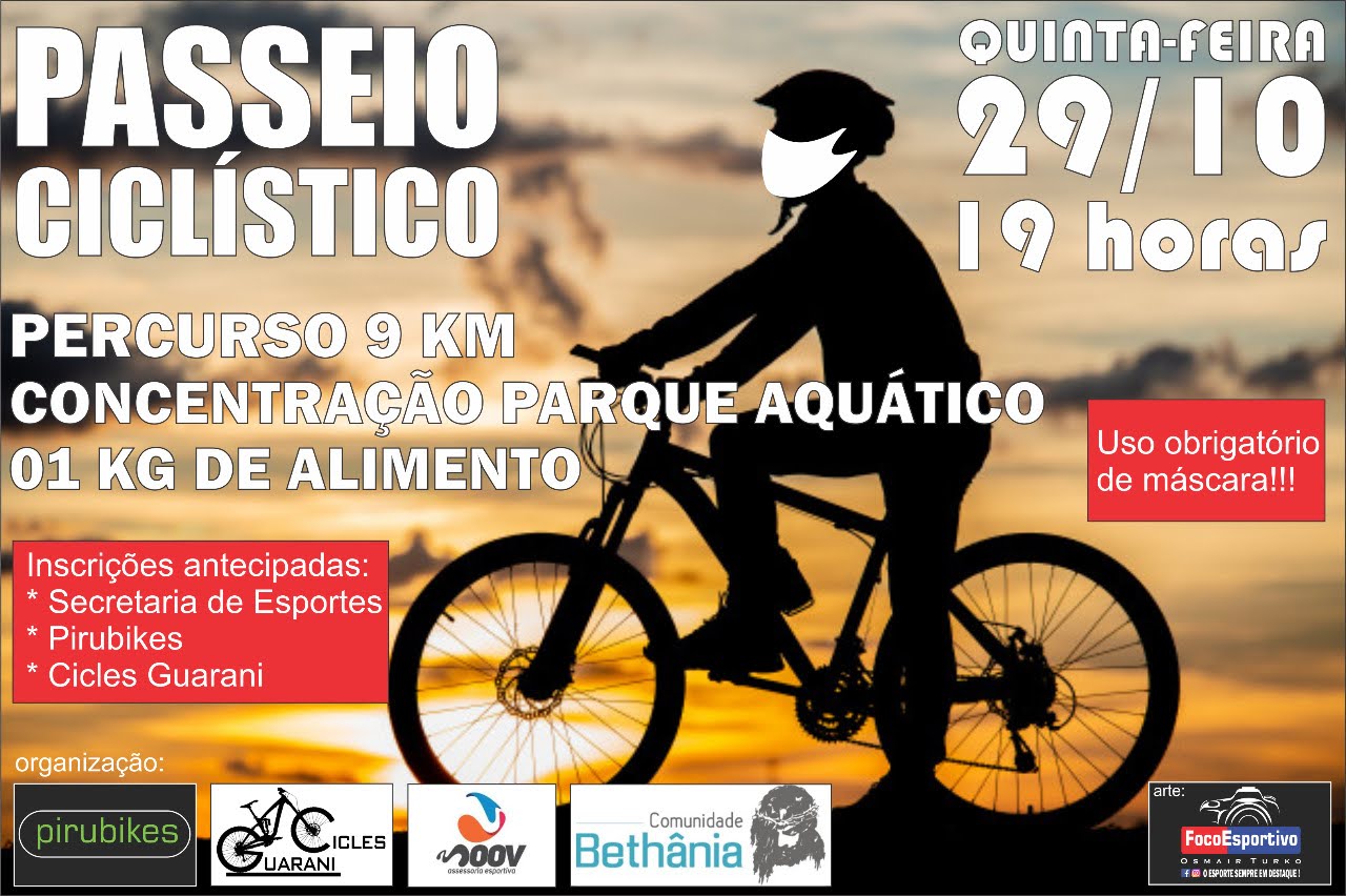 “A partir das 18 h estaremos fazendo a inscrição antecipada [no Parque Aquático]. Também estamos fazendo a inscrição antecipada na secretaria de Esportes, Pirubikes e Cicles Guarani para evitar aglomeração antes do passeio. O quilo de alimento será repassado a Comunidade Bethânia e haverá sorteio de brindes no sábado”, afirma o secretário de Esportes, Moisés Neves.