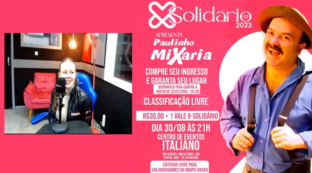 O humorista, ator e cineasta Paulinho Mixaria será a atração no lançamento da 14ª edição da campanha X-Solidário, que acontece nesta quarta-feira (30), no Centro de Eventos Italiano, a partir das 21 h. Neste ano, o lançamento da campanha será aberto ao público, que poderá acompanhar o show de humor e colaborar com a campanha promovida pelo Grupo Ivasko, que busca arrecadar fundos para instituições que colaboram no tratamento de pessoas com câncer.