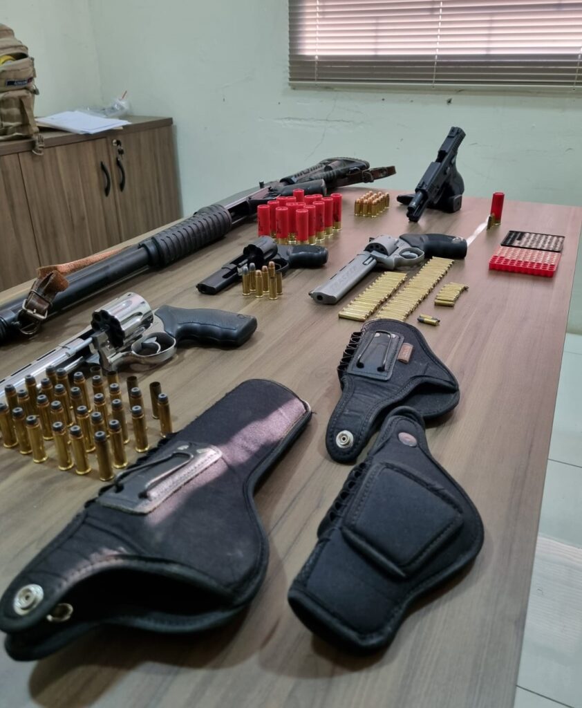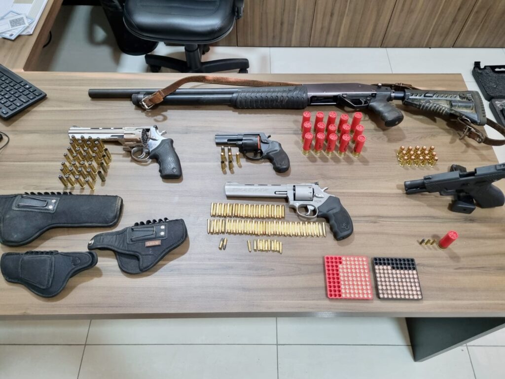 Durante a investigação, os policiais verificaram que os autores tinham uma arma de fogo, munições e acessórios. Esses objetos foram localizados em dois endereços diferentes e acabaram sendo apreendidos. A Polícia Civil apreendeu cinco armas e 153 munições de diferentes calibres, sendo 12, 22, 38 e 357.