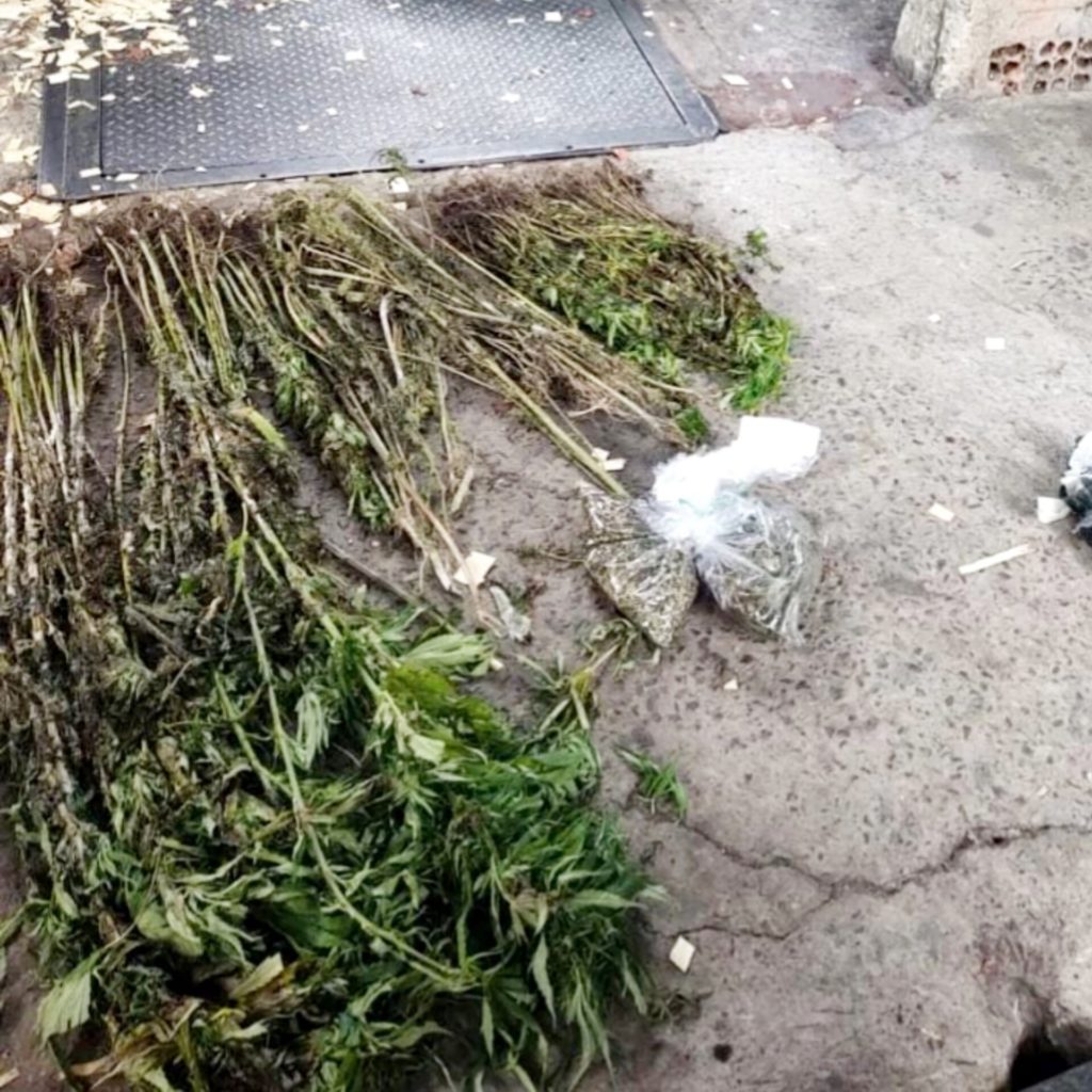 Os pés de maconha estavam sendo cultivados nos fundos do imóvel. A Polícia Civil constatou que havia um ciclo completo de cultivo e preparação da droga.