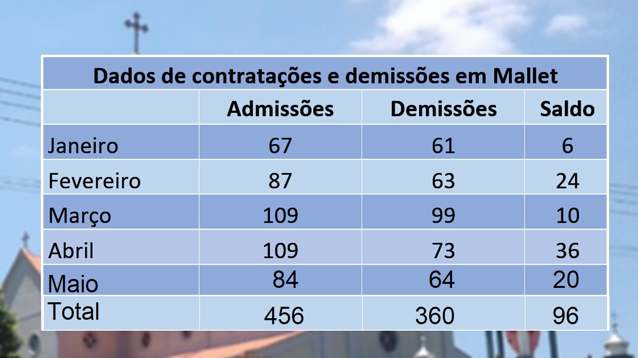 Outro município com balanço positivo foi Mallet que registrou o saldo de 20 vagas. Comparado ao mês anterior, os números foram menores (109 admissões e 73 demissões em abril), mas a cidade conseguiu registrar mais admissões do que demissões. Em maio, foram 84 admissões e 64 demissões.