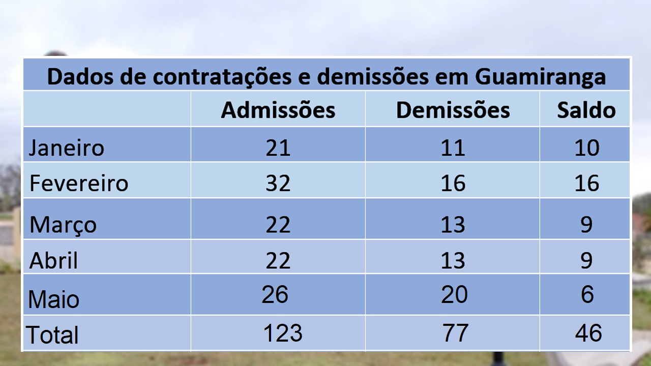 Na somatória de todos os municípios, a região registrou em maio 1.208 admissões e 1.145 demissões, terminando o mês com saldo positivo de 63 vagas. No acumulado do ano, foram geradas até maio 7.127 admissões e 5.603 demissões, gerando um saldo positivo de 1.524 vagas.