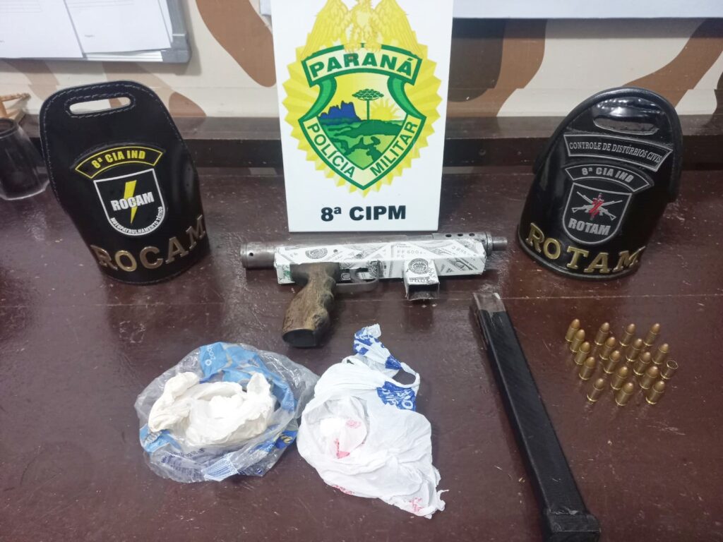 As equipes da Rotam, Rocam e P2 da Polícia Militar localizaram uma submetralhadora de 9 milímetros de fabricação caseira, 17 munições e 86,1 gramas de cocaína em uma residência em Irati, no fim da noite de ontem.