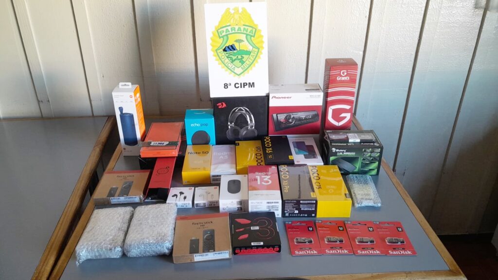 Durante buscas no carro foram encontrados nove celulares, duas TVs, quatro pen drives, uma TV Box, dois HDs, dois mouses, dois fones de ouvido, um mini game, um relógio, duas caixas de som, um rádio e um litro de whisky. Os produtos foram apreendidos e encaminhados para a sede da Receita Federal de Ponta Grossa.