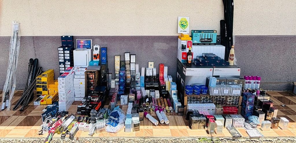 Ações distintas resultaram na apreensão de celulares, iPads, cigarros eletrônicos, perfumes, equipamentos eletrônicos e mais de 150 garrafas de vinhos importados sem regularização aduaneira/Paulo Sava, com informações da Polícia Militar