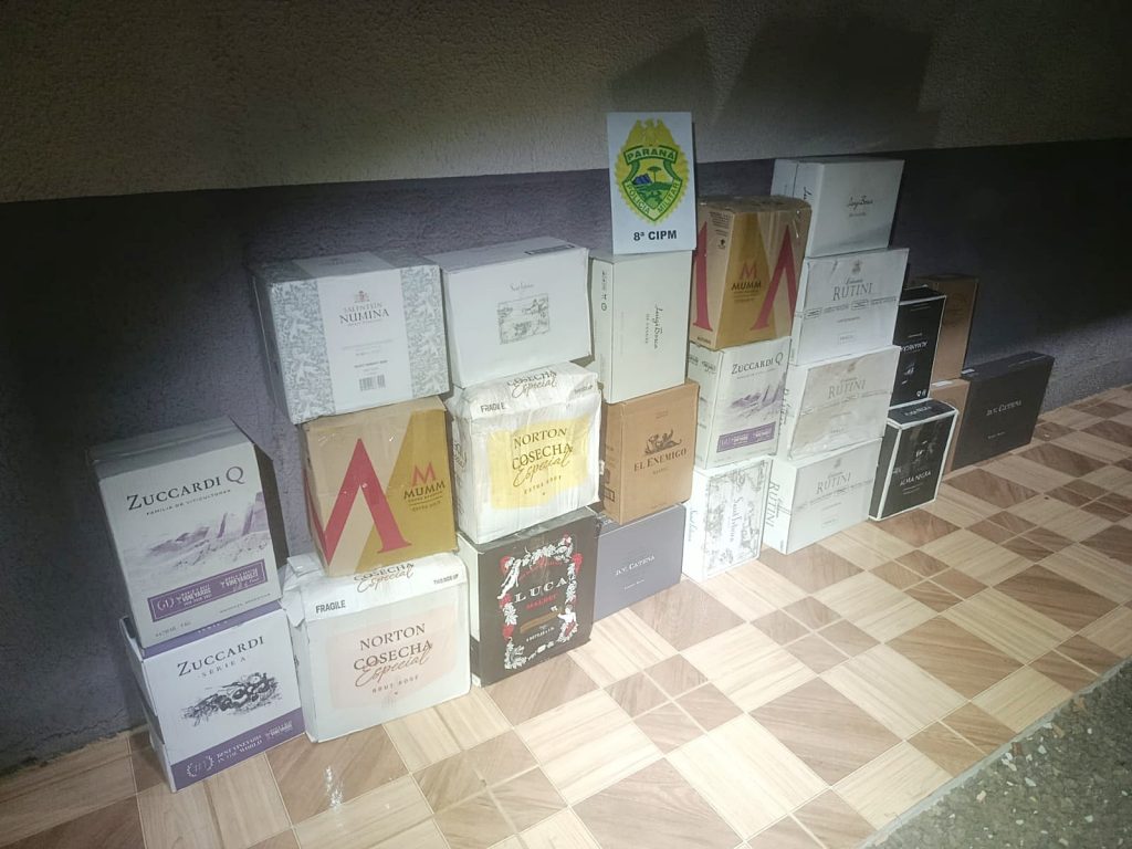 Na abordagem, foi constatado que o veículo era ocupado por um casal e uma criança, além de diversas caixas de papelão armazenadas no interior do automóvel. Questionado, o condutor informou que transportava vinhos de origem estrangeira.