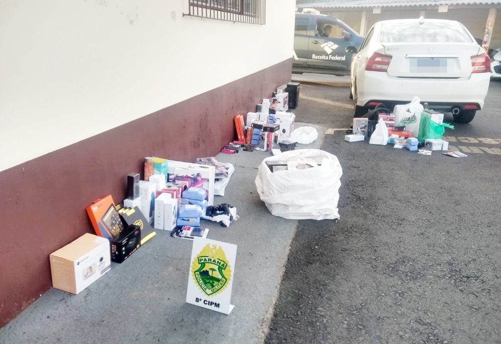 A Polícia Militar apreendeu produtos eletrônicos, bebidas, perfumes, celulares e outros objetos que estavam sendo transportados em um veículo Honda City abordado ontem na PR-364, em Inácio Martins.