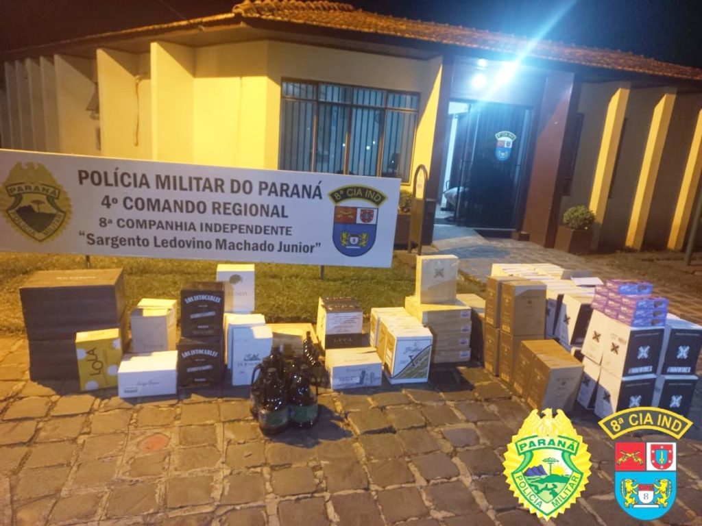 A Polícia Militar apreendeu aproximadamente 80 caixas de vinho que estavam em um veículo Fiat Doblo Adventure, que foi abordado na rua José Fillus, em Irati. Dois homens estavam no carro no momento da abordagem. Eles disseram que pegaram a mercadoria no município de Santo Antônio do Sudoeste.