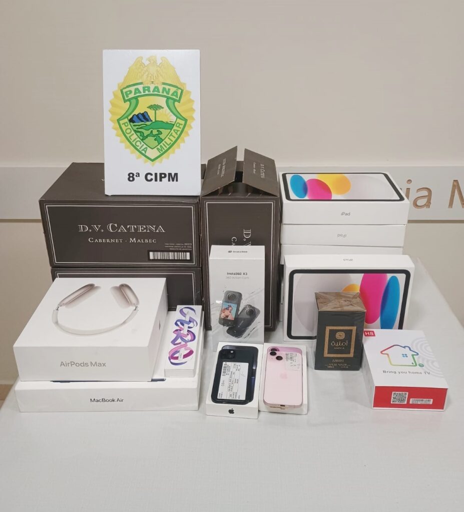 A Polícia Militar de Irati apreendeu alguns produtos de origem estrangeira, que estavam sendo transportados em um veículo Volkswagen UP abordado na BR-277, na manhã de terça-feira. Os policiais encontraram vários produtos eletrônicos e caixas de vinho compradas no Paraguai no bagageiro do carro.