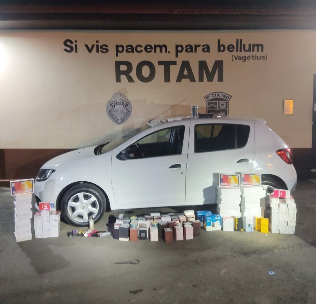 A segunda abordagem ocorreu nas proximidades do trevo de acesso à Irati. A PM verificou que um casal ocupava um veículo Nivus. Várias caixas com mercadorias de origem estrangeira foram encontradas no porta-malas e no banco traseiro.