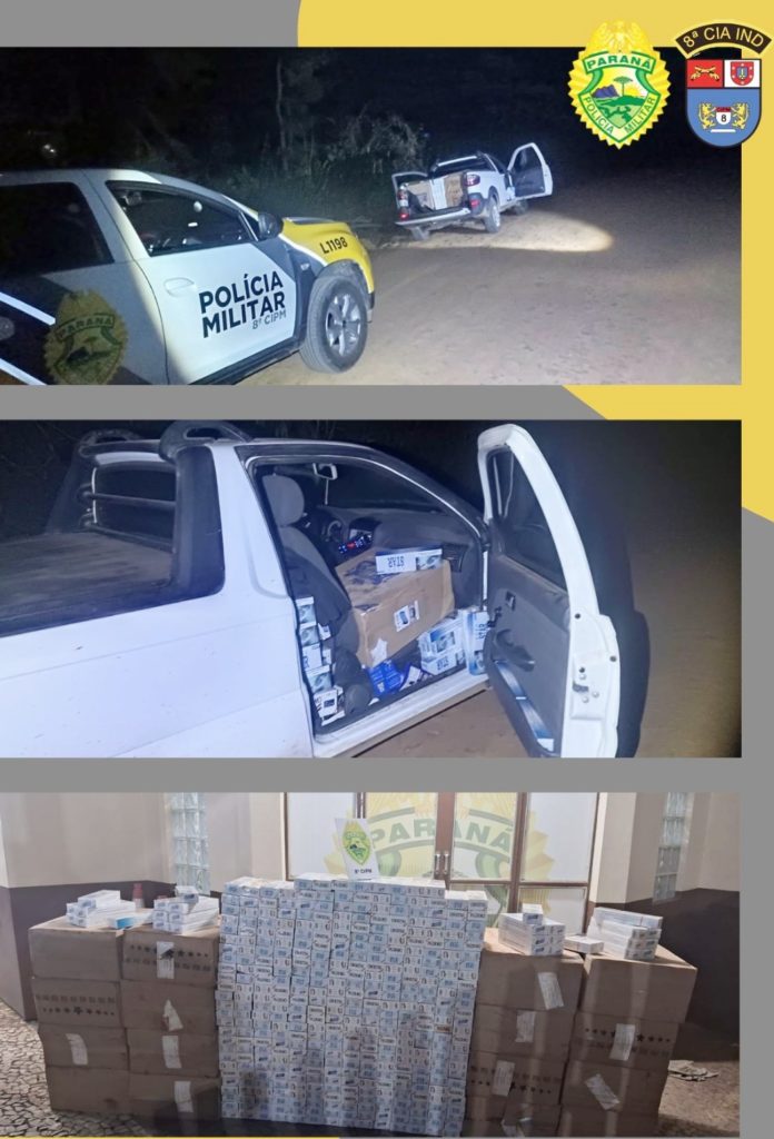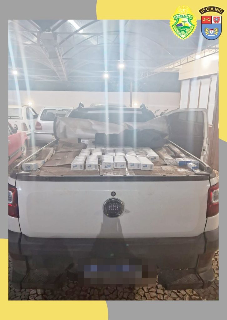 A Polícia Militar apreendeu 1.175 maços de cigarro de origem paraguaia no início da noite de ontem no interior de Ivaí. Os produtos estavam em um veículo Fiat Strada. O motorista que estava transportando a mercadoria chegou a fugir da abordagem e entrar numa mata. Porém, ele foi localizado e preso.