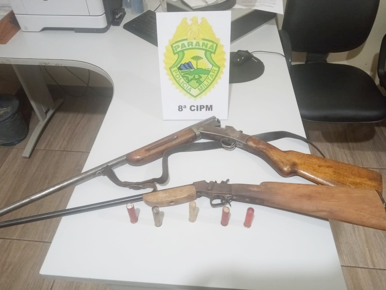 | Duas espingardas e cinco munições foram localizadas em residência no interior de Ivaí. Foto: PM/Divulgação |