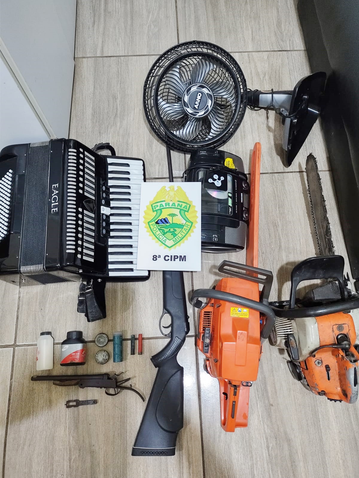 O homem disse que furtou uma motosserra, um rádio, um ventilador, uma espingarda 5.5 milímetros que estava aberta para o calibre 22 e uma gaita de 80 baixos. Ele também informou que os objetos estavam em sua casa. Os objetos furtados foram encontrados no quarto do morador. Eles estavam embaixo da cama e num guarda-roupa. Dentro de uma caixa havia uma garrucha. O homem foi preso e conduzido para a Delegacia de Irati.