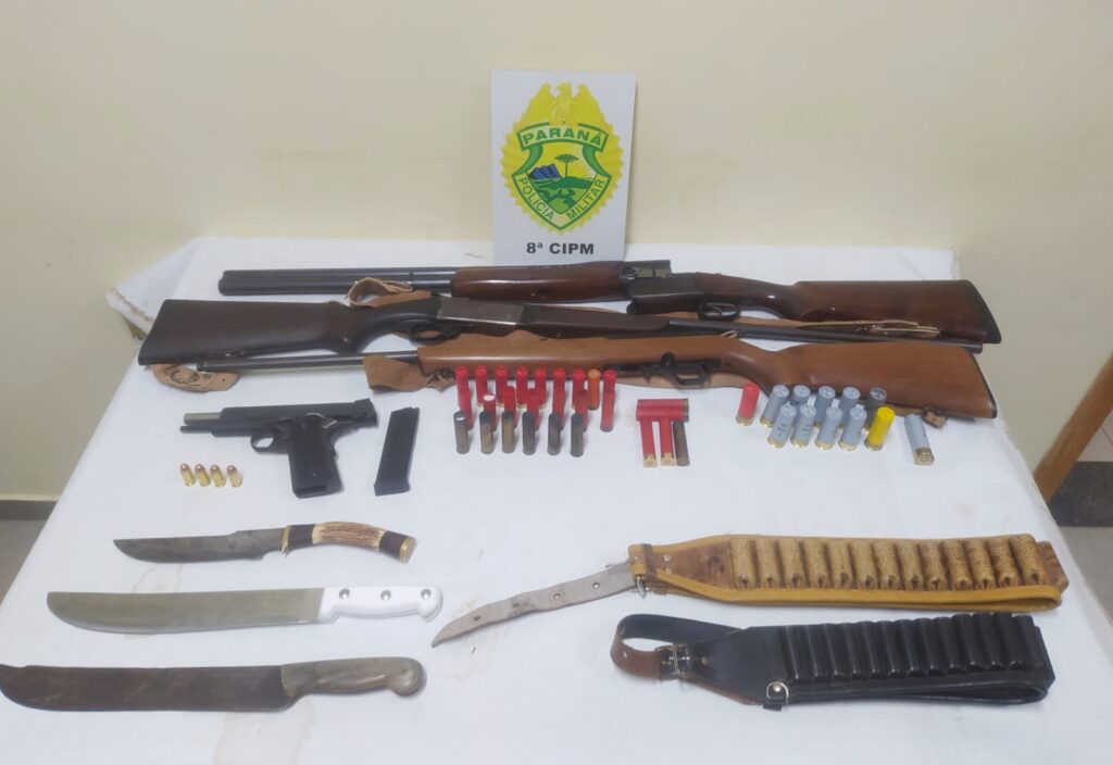 A PM realizou buscas e localizou o veículo. Durante a abordagem foi constatado que o condutor apresentava sinais de embriaguez. Dentro da caminhonete foram encontradas três espingardas e uma pistola calibre 45 milímetros, com um carregador com quatro munições, além de dois cintos cartucheiros, dois facões e uma faca. Os policiais ainda encontraram várias munições acomodas em um saco.