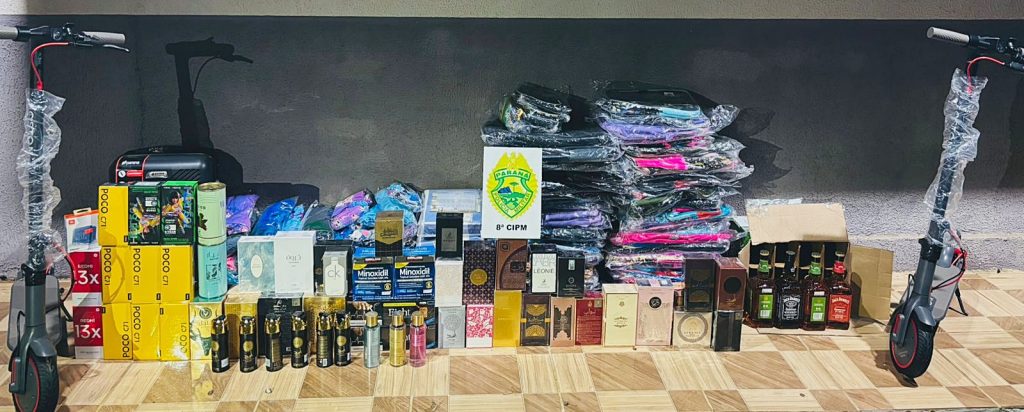 Durante a busca veicular, os policiais encontraram uma grande quantidade de mercadorias de origem estrangeira, entre elas aparelhos celulares, relógios, caixas de som, fones de ouvido, tablets, acessórios de informática, videogames, perfumes, cigarros e materiais de pesca. O veículo era conduzido por um motorista de aplicativo, que transportava duas mulheres, responsáveis pela carga, oriundas do Estado de Santa Catarina, moradoras de Balneário Camboriú.