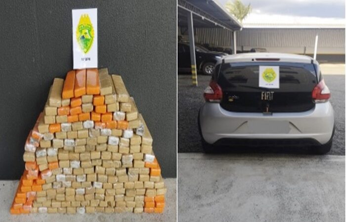 Motorista, de 21 anos, foi preso por tráfico de drogas. Drogas estavam em um veículo Fiat Mobi abordado na BR-277
