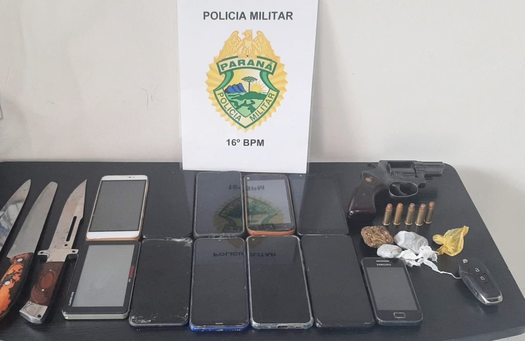 A vítima, de 31 anos, disse que a autora das ameaças de morte estava com duas facas. Ela também comentou que o local é conhecido como ponto de tráfico de drogas e denunciou que havia entorpecentes em uma residência anexa à boate. Os policiais foram até o local e realizaram buscas no imóvel. A PM encontrou três facas, sendo duas em uma gaveta e outra no quarto da casa. Um revólver calibre 38 com cinco cartuchos intactos foi localizado embaixo de uma cômoda. Já na bolsa da dona da boate foram encontradas quatro porções de maconha, totalizando 26 gramas. Os policiais ainda encontraram dez celulares, duas TVs de 32 polegadas, duas bicicletas e uma lavadora de alta pressão.