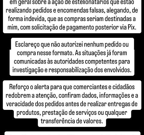 De acordo com a nota, os golpistas estariam realizando pedidos e encomendas falsas, informando de maneira indevida que as compras seriam destinadas ao prefeito, com solicitação de pagamento posterior via Pix. “Esclareço que não autorizei nenhum pedido ou compra nesse formato”, afirma Emiliano Gomes no comunicado.