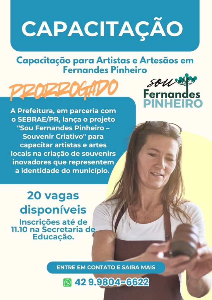 A Prefeitura de Fernandes Pinheiro em parceria com o Serviço Brasileiro de Apoio às Micro e Pequenas Empresas (SEBRAE/PR) realizará uma capacitação de artistas e artesãos do município. São disponibilizadas 20 vagas. As inscrições podem ser feitas até essa sexta-feira na secretaria Municipal de Educação.