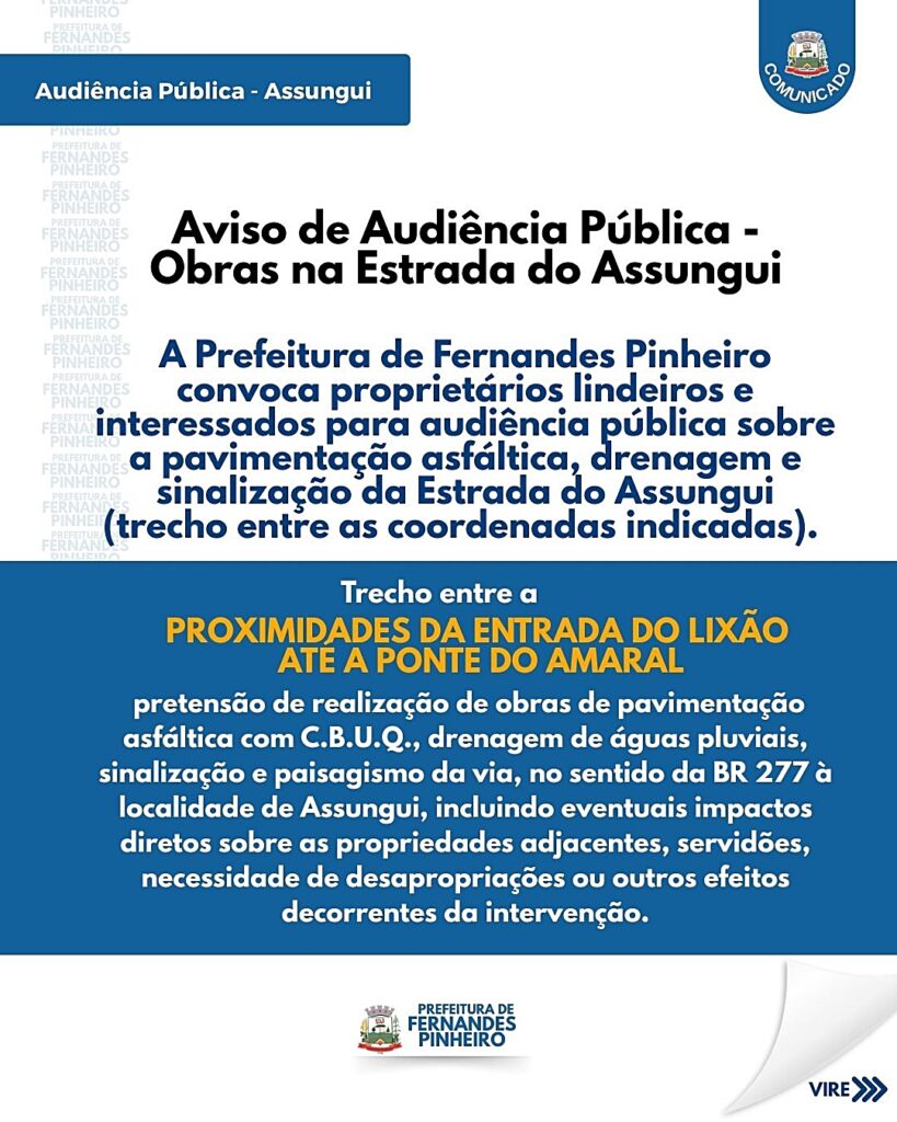 A Prefeitura de Fernandes Pinheiro convoca todos os moradores e proprietários de terra da localidade de Assungui para uma Audiência Pública sobre as obras de pavimentação da estrada da comunidade. O evento está marcado para a próxima segunda-feira, 19, a partir das 14 horas, na sala de reuniões da Prefeitura de Fernandes Pinheiro.