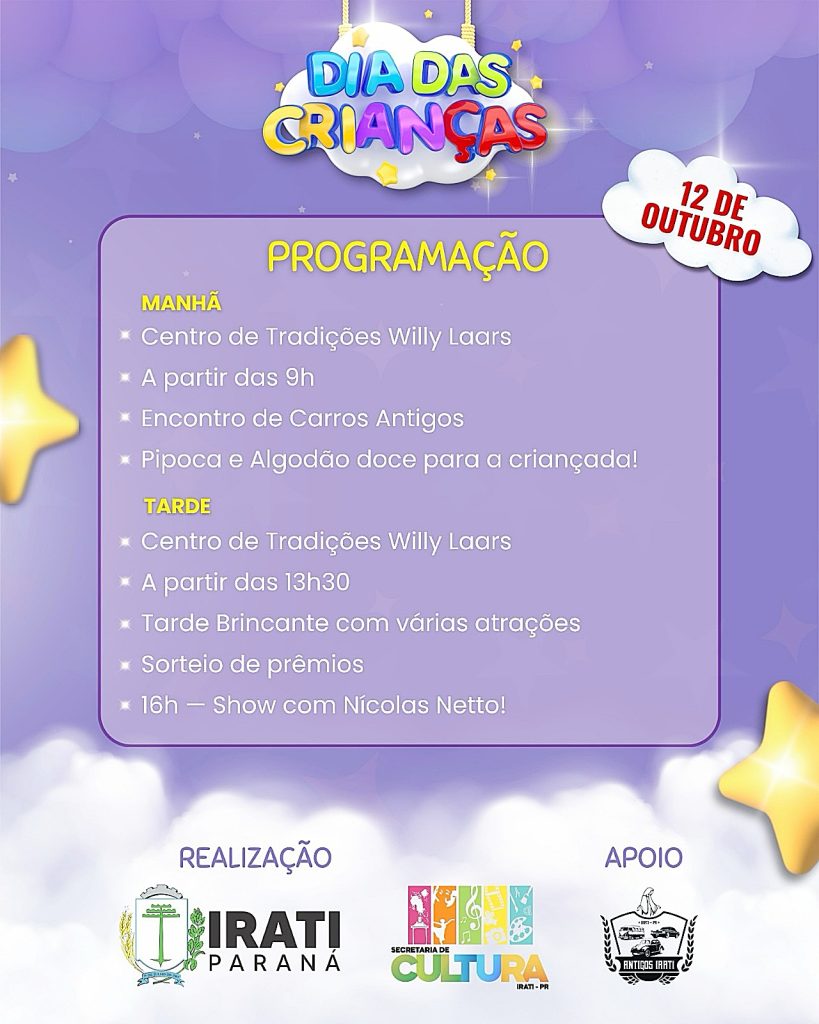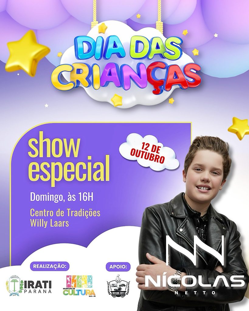 Neste domingo, dia 12 de outubro, Irati vai comemorar o Dia das Crianças. A programação, organizada pela Secretaria de Cultura e Turismo, promete reunir famílias inteiras em uma tarde cheia de atividades, brincadeiras e apresentações. Uma das atrações mais esperadas é a presença do influencer Nicolas Netto, conhecido nas redes sociais pelo bom humor e pela conexão com o público infantil.