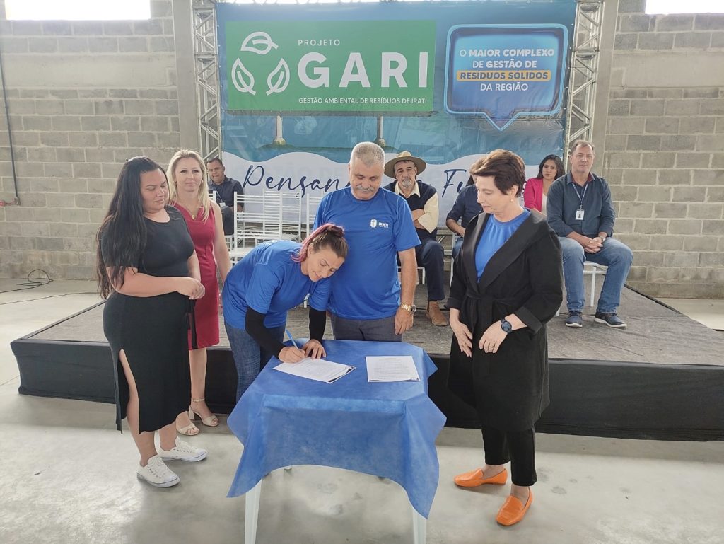 Presidente da cooperativa Malinoski, Luciane Malinoski, assinando documento autorizando utilização do Complexo Gari. Em destaque na imagem também estão a presidente da cooperativa Cocaair, Rosângela Souza, a secretária de Meio Ambiente, Magda Lozinski, o prefeito Jorge Derbli e a vice-prefeita Ieda Waydzik. Foto: Jussara Harmuch