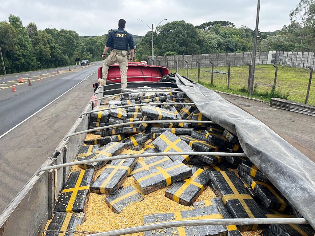 A Polícia Rodoviária Federal apreendeu 2.468 quilos de maconha na tarde de sábado (15), durante fiscalização na BR-277, em Guarapuava. A droga estava escondida no compartimento de carga de um caminhão que transportava milho. O motorista, de 41 anos, demonstrou nervosismo na abordagem e acabou preso por tráfico de drogas após a localização dos tabletes.