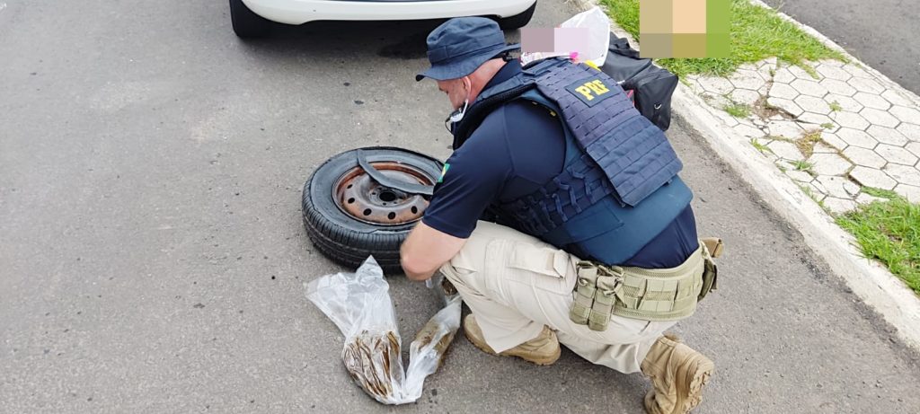Segundo a Polícia Rodoviária Federal (PRF), droga estava sendo transportada por um casal até Bombinhas-SC. Entorpecente estava escondido no estepe do veículo
