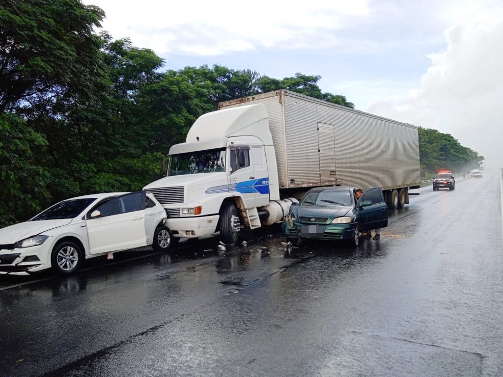 Quatro carros e um caminhão se envolveram em engavetamento na BR-376, em Ponta Grossa. Foto: PRF/Divulgação