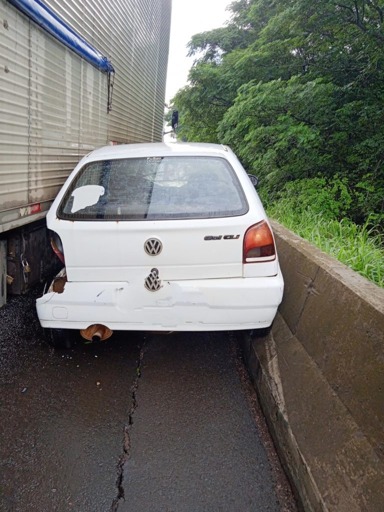 Gol ficou prensado na mureta após engavetamento na BR-376, em Ponta Grossa. Foto: PRF/Divulgação