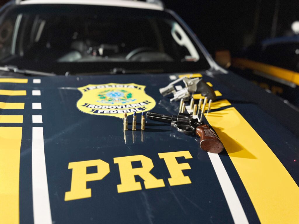 Dois revólveres e sete munições foram localizados em veículo abordado na BR-277, em Guarapuava. Foto: PRF/Divulgação