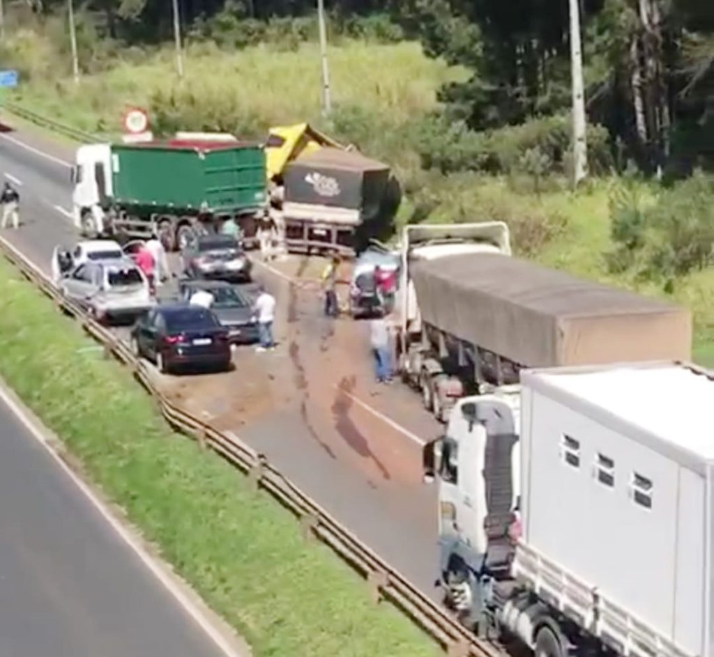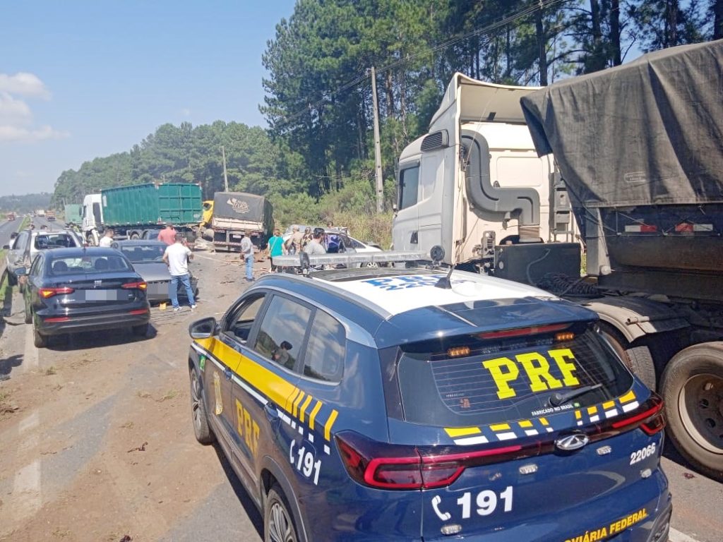 Na BR-376, em Ponta Grossa, foi registrado um engavetamento entre quatro caminhões e seis carros, resultando em dez veículos atingidos. Conforme a PRF, o motorista de um caminhão bitrem carregado com calcário não conseguiu frear adequadamente e colidiu com outros veículos que estavam parados sobre a pista. Esses carros aguardavam a liberação da pista, que foi interditada por um período para que fosse realizado um serviço de aferição de um radar fixo.
