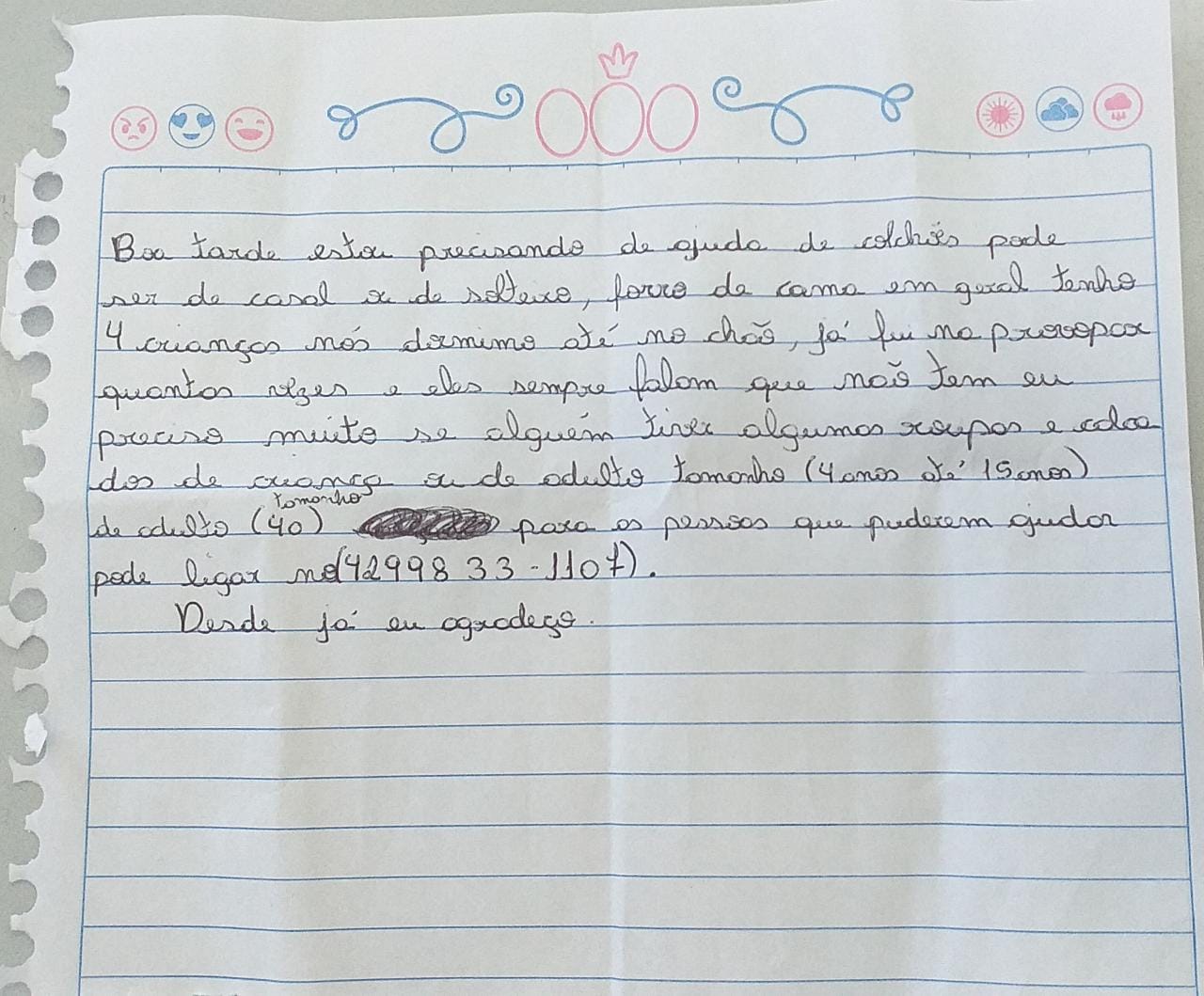 - Cartinha: Boa tarde, estou precisando de ajuda com colchões, pode ser casal ou solteiro, forro de cama em geral. Tenho 4 crianças e dormimos no chão. Já fui no Provopar várias vezes, mas eles dizem que não tem. Preciso muito, se alguém tiver roupas e calçados de criança (04 a 15 anos) e de adulto tamanho 40. Quem puder ajudar ligar: 9.9833-1107.