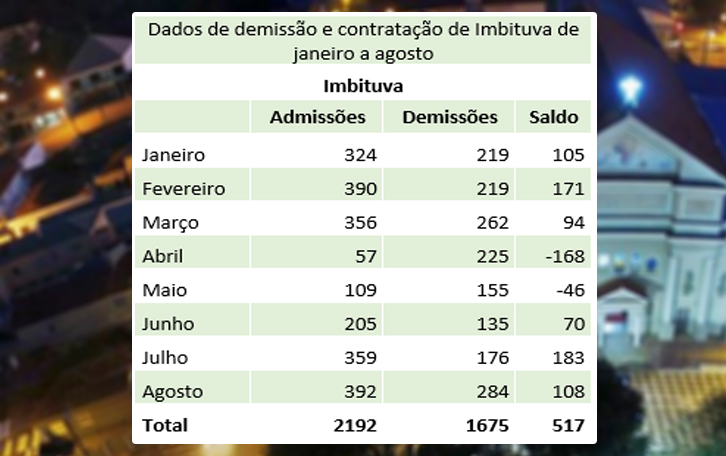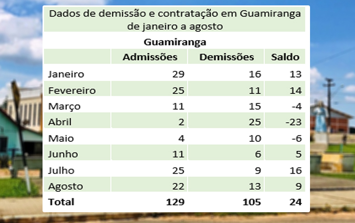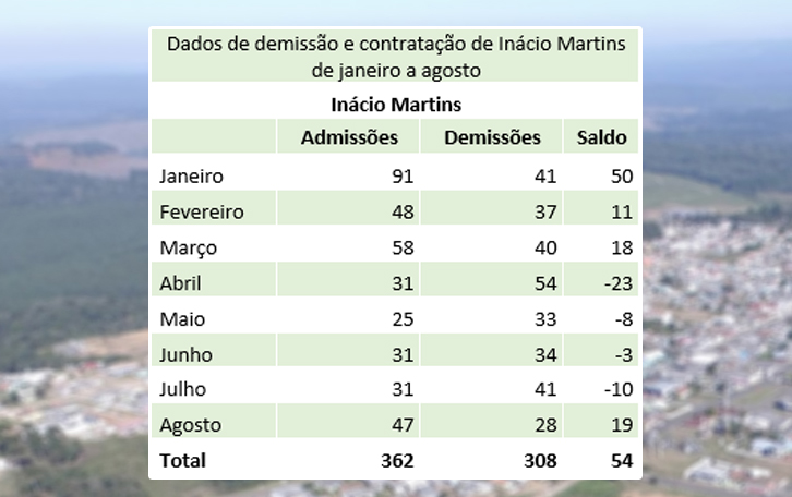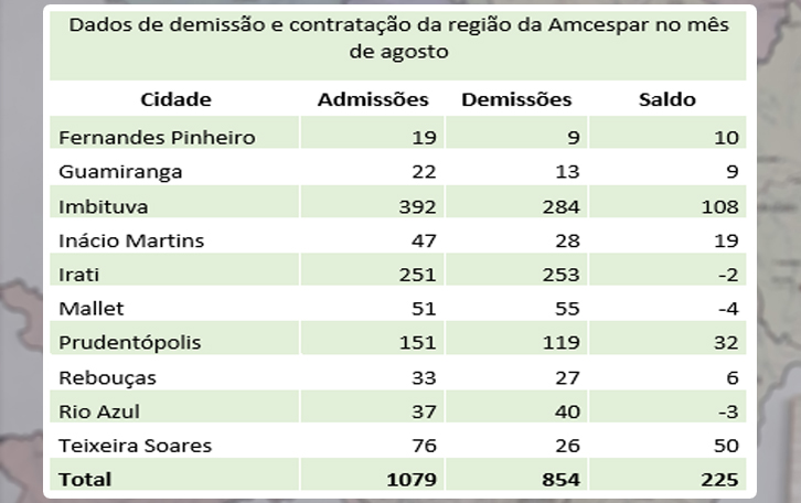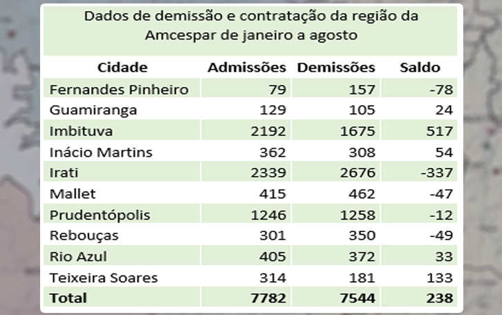 Já entre os municípios com saldos positivos, os que mais geraram emprego do que demissões são Imbituva, Teixeira Soares e Prudentópolis. Imbituva criou 392 novas vagas e teve 284 demissões, com saldo positivo de 108. Em Teixeira Soares, foram 76 contratações e 26 demissões, com saldo positivo de 50. Em Prudentópolis, foram 151 admissões e 119 demissões, com saldo positivo de 32. No acumulado do ano, a região Centro-Sul também teve saldo positivo de 238 vagas. De janeiro a agosto foram 7.782 admissões e 7.544 demissões.