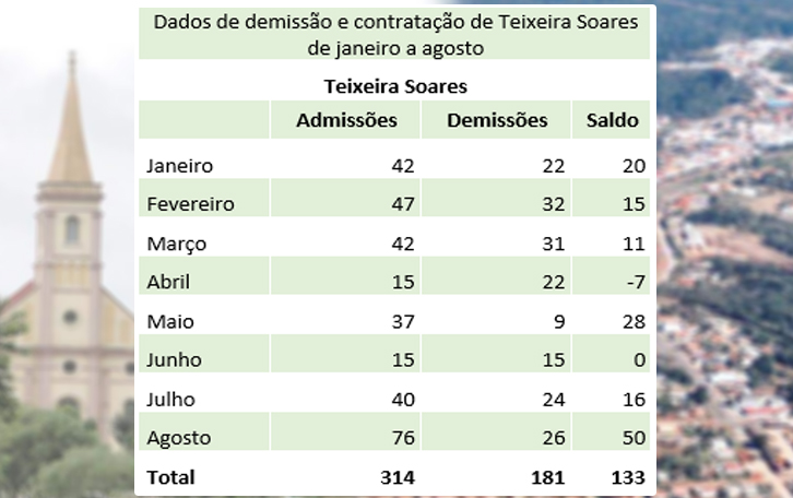 Em comparação aos últimos meses, alguns se destacaram com mais saldos positivos. Um deles é Teixeira Soares que registra mais empregos do que demissões nos últimos quatro meses. Porém, o mês de junho registrou a mesma quantidade de admissões e demissões. Mesmo assim, Teixeira Soares é a única cidade a apresentar só um mês com mais demissões.
