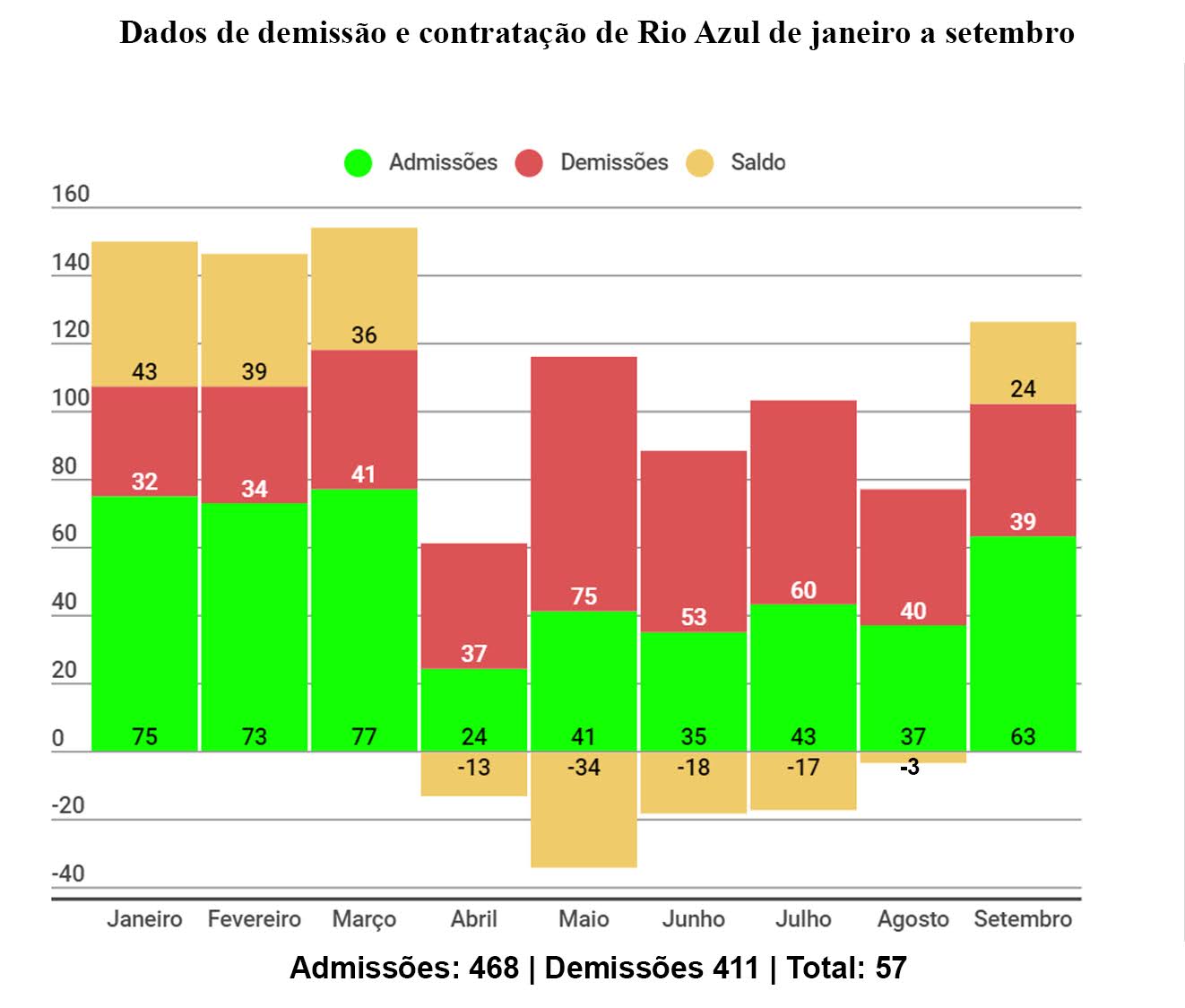 | Rio Azul teve 468 admissões e 411 demissões nos nove primeiros meses de 2020. Arte: Rádio Najuá |