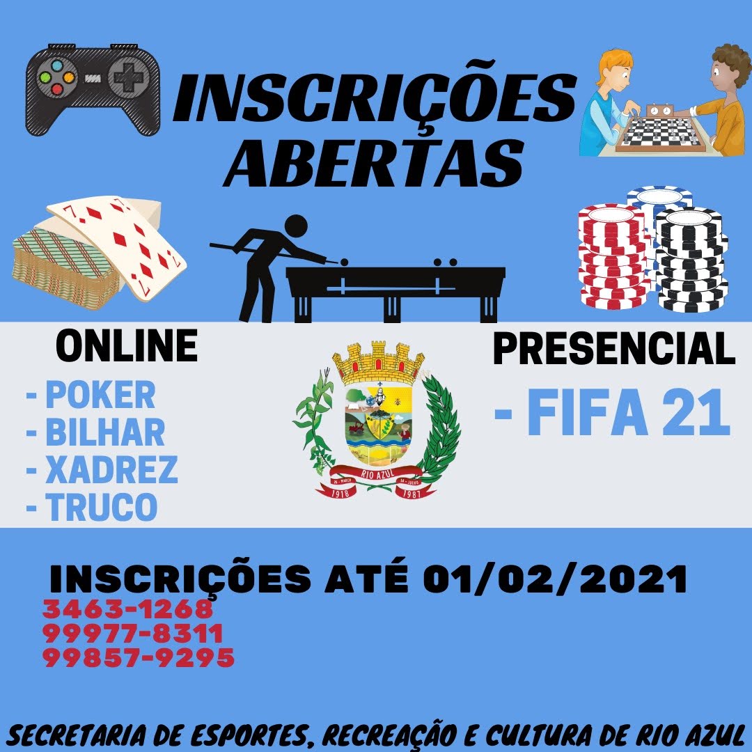 A secretaria de Esportes, Recreação e Cultura de Rio Azul está com inscrições abertas para quatro campeonatos online de Poker, Bilhar, Xadrez e Truco e também de futebol virtual no videogame Playstation 4. As inscrições podem ser realizadas até segunda-feira, dia 1º de fevereiro, na sede da secretaria que voltou a funcionar no ginásio Albino Ianoski (Albinão) ou nos telefones 3463-1268, 9-9977-8311 e 9-9857-9295.