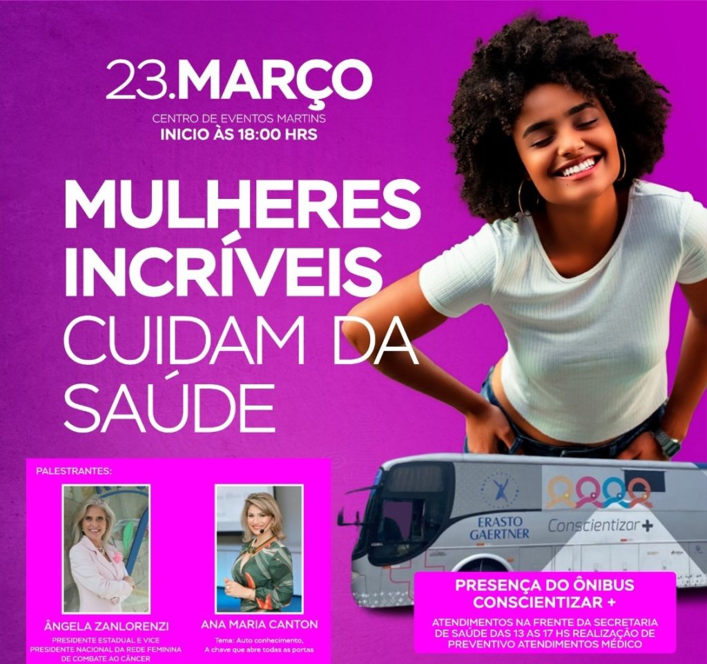 A Secretaria Municipal de Saúde de Rio Azul promoverá hoje, 23, o evento “Mulheres incríveis cuidam da saúde”, a partir das 18 horas, no Centro de Eventos Martins. O objetivo do encontro é conscientizar as mulheres sobre a importância dos cuidados com a própria saúde.