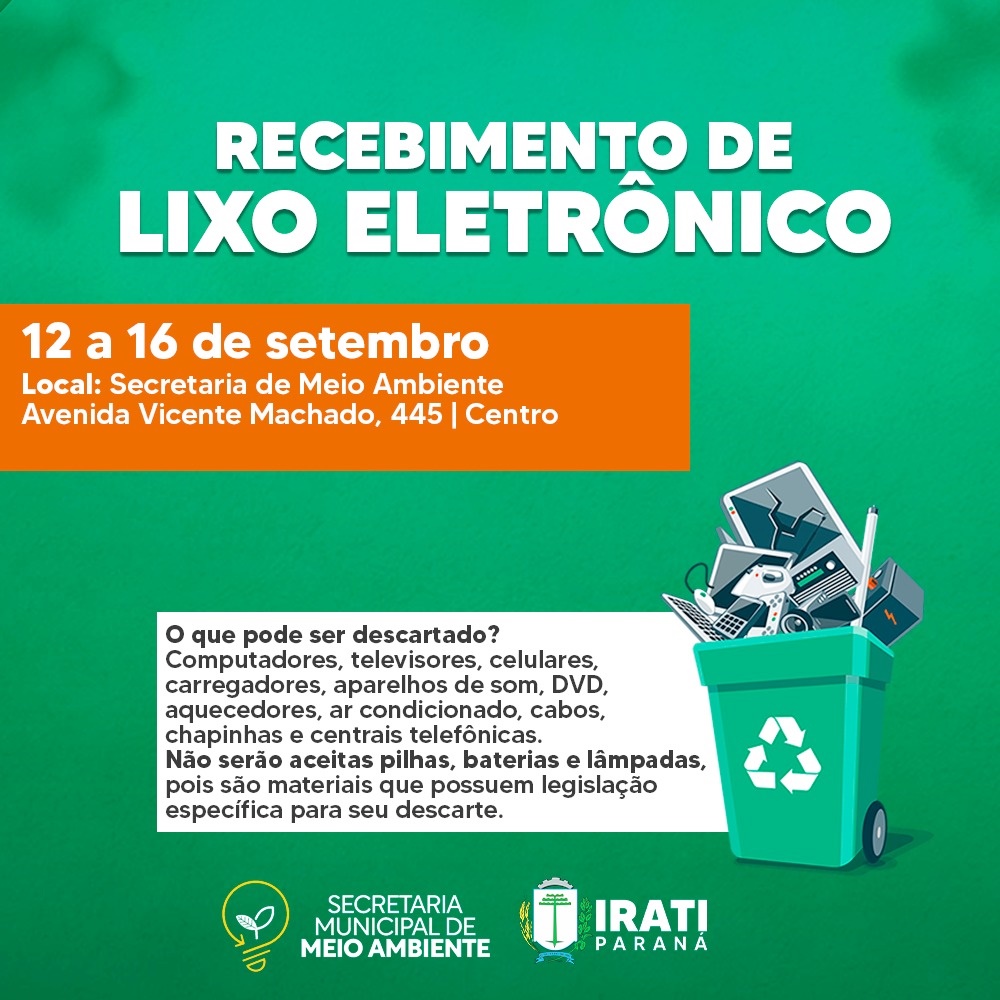 A Secretaria de Meio Ambiente de Irati iniciou uma ação de recolhimento de Lixo Eletrônico. Desde o início da semana até sexta-feira, dia, 6, a população pode descartar computadores, TVs, celulares, carregadores, aparelhos de som, DVD, aquecedores, ar condicionado, cabos, chapinhas e centrais telefônicas. Pilhas, baterias e lâmpadas não estão sendo recolhidas, pois são materiais que possuem legislação específica para seu descarte.