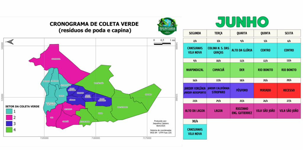 Os setores da coleta verde são separados por cor e cada bairro será atendido uma vez na semana, com exceção do centro, Rio Bonito e Vila São João, que são bairros com maior demanda, e por isso, receberão a coleta a cada 15 dias. “Vai ter coleta, sim. Vamos continuar com a coleta porta a porta, fazendo aquela varredura no bairro inteiro e coletando tudo que tem para fora. E também conseguindo atender os bairros de maior demanda com duas vezes no mês”, salienta a secretária.