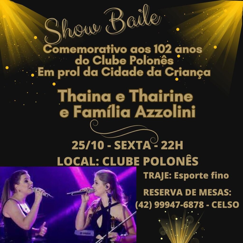 Um show-baile beneficente em prol da Cidade da Criança de Irati será realizado na próxima sexta-feira (25), a partir das 22h, no Clube Polonês de Irati. O evento terá animação de Thainá e Thairine e Família Azzolini. Na ocasião, também será comemorado os 102 anos do Clube Polonês de Irati. Não serão vendidos ingressos avulsos. Haverá apenas reserva de mesas de quatro lugares, a R$ 400. Segundo a organização, ainda há entre dez e 15 mesas disponíveis. O traje recomendado deve ser esporte fino.