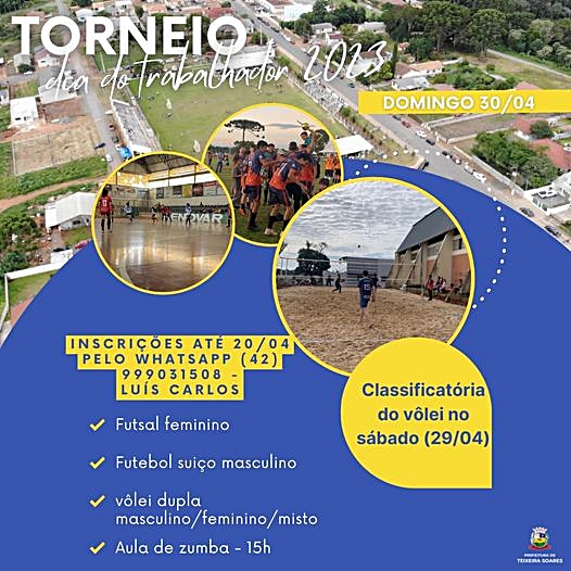 O município de Teixeira Soares realizará as festividades alusivas ao Dia do Trabalhador neste domingo, 30, no Estádio Municipal, a partir das 08 horas. Haverá torneios de futebol suíço masculino, futsal feminino, vôlei de duplas masculino, feminino e misto. A programação se estenderá ao longo do dia todo. Os participantes dos torneios receberão um almoço com costela assada no fogo de chão e os acompanhamentos. Às 12 horas, será realizada a solenidade de abertura do evento.