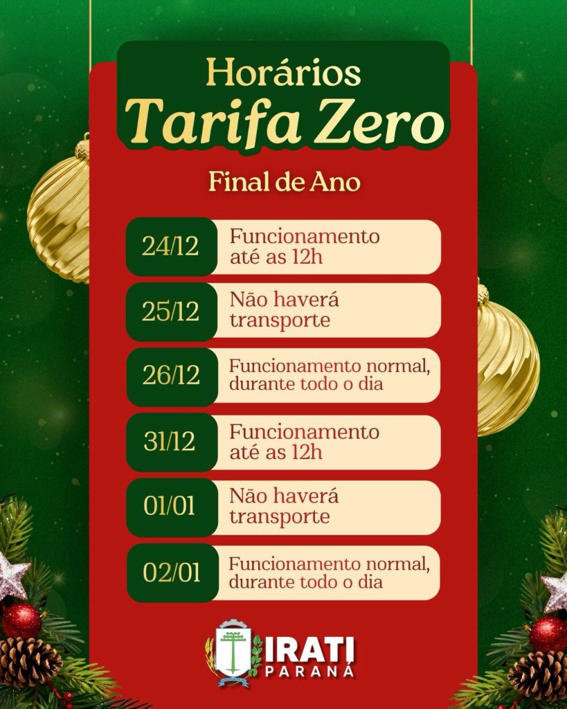 A Prefeitura de Irati divulgou os horários especiais de funcionamento do transporte público municipal que continua com a Tarifa Zero durante o período de fim de ano. O serviço, que garante deslocamento gratuito à população, terá alterações nos dias 24, 25 e 31 de dezembro, além de 1º de janeiro.
