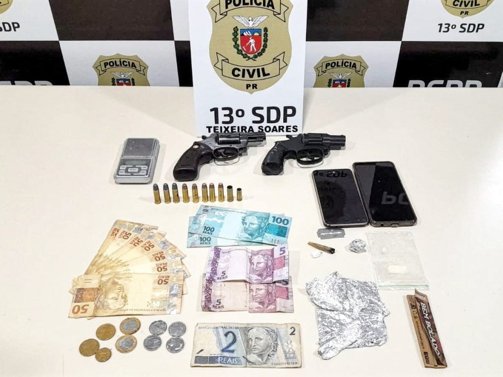 Em Teixeira Soares, a Polícia Civil prendeu um homem suspeito de cometer o crime de tráfico de drogas. Na manhã de ontem, os policiais cumpriram mandados de busca e apreensão e prisão no município. Um revólver calibre 38 com a numeração raspada, um simulacro de arma de fogo, munições intactas e deflagradas, drogas (crack e maconha), uma balança de precisão, dois celulares, lâminas para o corte de drogas e papel seda, além da quantia de R$566,60 em dinheiro foram apreendidos durante as buscas. O homem detido foi encaminhado ao presídio Hildebrando de Souza, em Ponta Grossa.