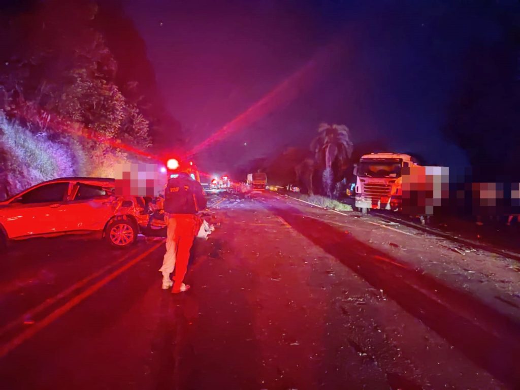 Carro das vítimas pegou fogo após ser atingido por um caminhão que teve problemas nos freios na descida da Serra da Esperança, conforme informações da PRF. Outros carros e caminhões se envolveram no acidente, que causou a interdição da rodovia