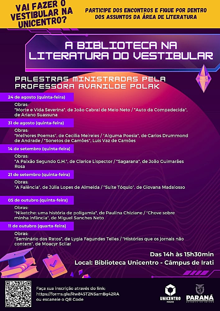 Segundo Avanilde, a lista de obras do vestibular da Unicentro é atualizada a cada dois anos. “Este ano houve mudanças das obras do vestibular. Então, esta mesma lista de obras vai ser para os vestibulares de 2023 e 2024. Então, este público de 2º e 3º ano é o principal, mas é muito legal contar com a participação de alunos de outras séries e de pessoas que gostam de literatura e queiram vir discuti-la. A literatura sempre é boa de estudar, conhecer novos mundos, novas realidades, novos contextos, fazer viagem no mundo da fantasia e de releituras da realidade”, comentou.