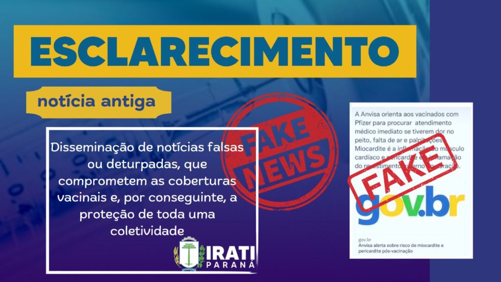 Assim, o Ministério da Saúde, a Secretaria de Estado da Saúde do Paraná e a Secretaria Municipal de Saúde de Irati mantêm-se a recomendação de vacinação para toda população, com indicação do uso do imunizante Pfizer/Cominarty, sem restrições, e faz um alerta sobre o risco potencial que existe da disseminação de notícias falsas ou deturpadas, que comprometem as coberturas vacinais e, por conseguinte, a proteção de toda uma coletividade.