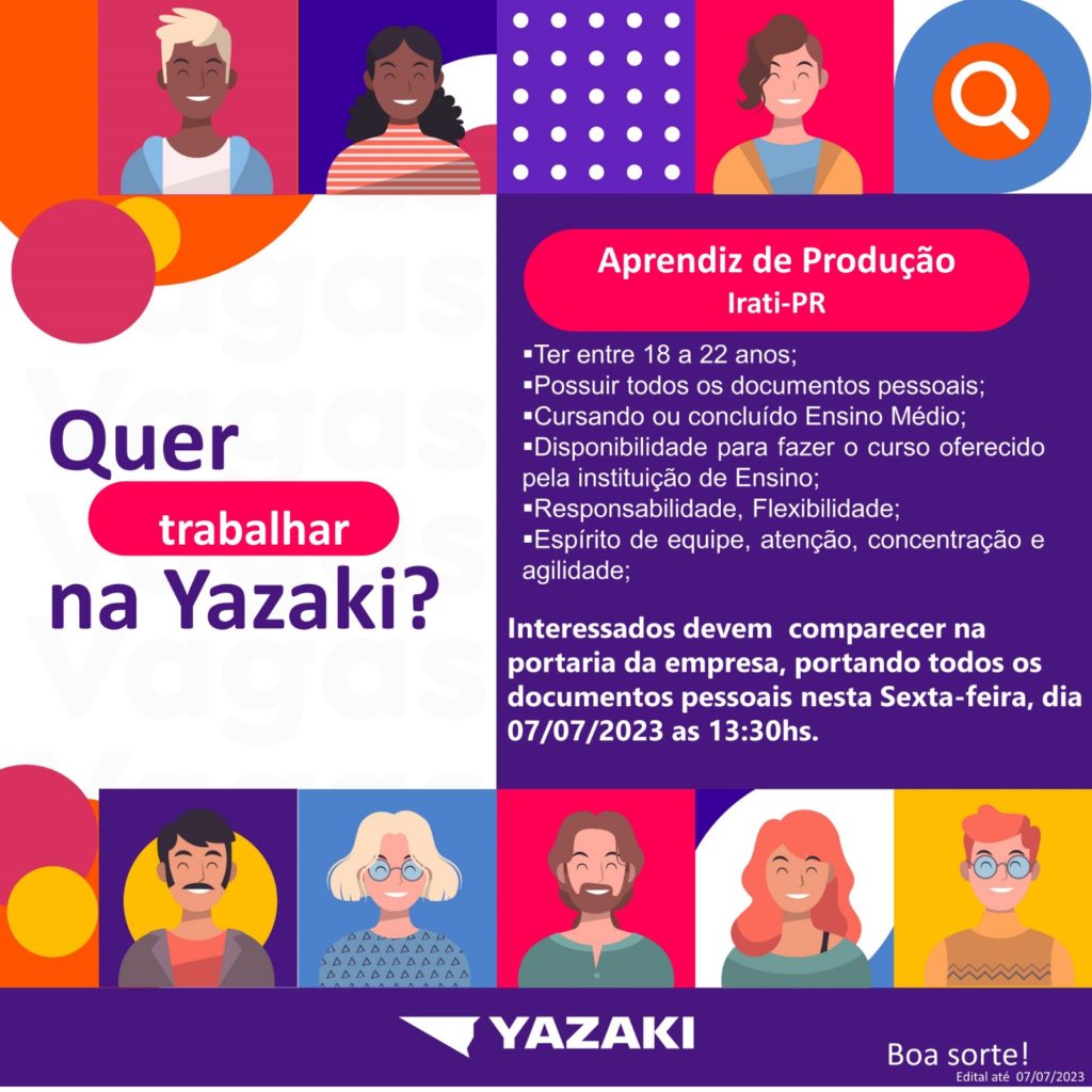 A empresa Yazaki realizará uma nova seleção para contratação de jovens para atuar como aprendiz de produção. São disponibilizadas 19 vagas. Os interessados devem ter idade entre 18 e 22 anos.
